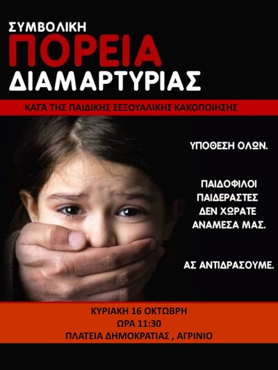 Καλούν και αυτοί και συμμετέχουν στην συμβολική πορεία διαμαρτυρίας ΚΑΤΑ ΤΗΣ ΠΑΙΔΙΚΗΣ ΣΕΞΟΥΑΛΙΚΗΣ ΚΑΚΟΠΟΙΗΣΗΣ αλλά και κάθε μορφή κακοποίησης προς ένα παιδί, γιατί τα παιδιά μας πρέπει να μεγαλώνουν με αγάπη και ασφάλεια!!! Η πορεία θα γίνει στις 11.30 το πρωί της Κυριακής στην πλατεία Δημοκρατίας.