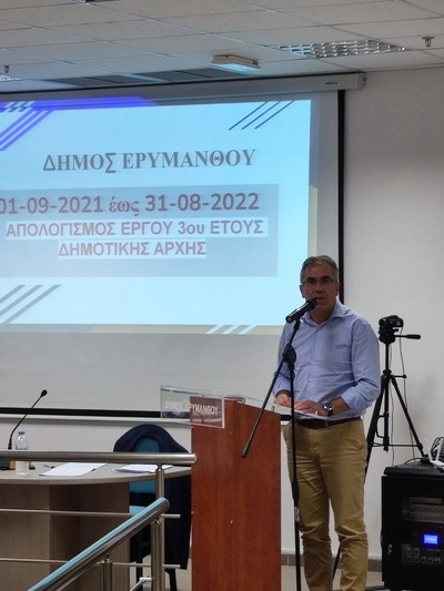 Όσον αφορά στον απολογισμό, ο Δήμαρχος Ερυμάνθου αναφέρθηκε αναλυτικά στα έργα και δράσεις που έχουν γίνει ή ξεκινούν σύντομα ή έχουν προγραμματιστεί ανά τομέα.