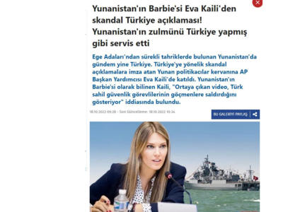 Η Hurriyet (κεντρική φωτό) δημοσιεύει άρθρο με τίτλο «Σκανδαλώδης δήλωση κατά της Τουρκίας από Έλληνα πολιτικό» και λεζάντα «Η Τουρκία για άλλη μια φορά στην ατζέντα της γειτονικής Ελλάδας. Η αντιπρόεδρος του Ευρωπαϊκού Κοινοβουλίου, Εύα Καϊλή, στο καραβάνι των πολιτικών που στοχεύουν την Τουρκία. Μια "σκανδαλώδης" δήλωση κατά της Τουρκίας από την Ελληνίδα πολιτικό».