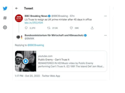 Η διεθνής διπλωματία, η βρετανική πολιτική και η αμερικανική ραπ μπορεί να είναι ένας κακός συνδυασμός. Αυτό έμαθε το υπουργείο Οικονομικών της Γερμανίας αφού ανήρτησε στο Twitter έναν σύνδεσμο με ένα βίντεο του μουσικού συγκροτήματος Public Enemy ως αντίδραση στην είδηση της παραίτησης της πρωθυπουργού της Βρετανίας Λιζ Τρας.