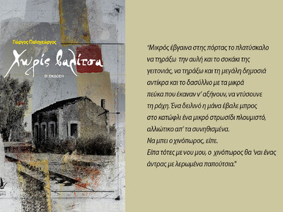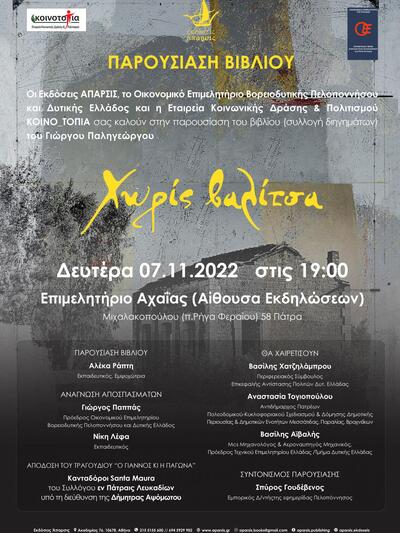 Οι Εκδόσεις ΑΠΑΡΣΙΣ, το Οικονομικό Επιμελητήριο Βορειοδυτικής Πελοποννήσου και Δυτικής Ελλάδος και η Κοινο_Τοπία (Εταιρεία Κοινωνικής Δράσης & Πολιτισμού) συνδιοργανώνουν εκδήλωση παρουσίασης του βιβλίου με τίτλο «Χωρίς Βαλίτσα» (συλλογή διηγημάτων) του Γιώργου Παληγεώργου, στην Αίθουσα Εκδηλώσεων του Επιμελητηρίου Αχαΐας, Μιχαλακοπούλου (π. Ρήγα Φεραίου) 58, στην Πάτρα την Δευτέρα 7 Νοεμβρίου 2022 στις 19:00.
