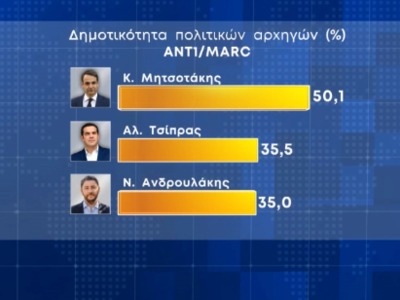 Στη δημοτικότητα των πολιτικών αρχηγών ο Κυριάκος Μητσοτάκης συγκεντρώνει 50,1%, ο Αλέξης Τσίπρας 35,5% και ο Νίκος Ανδρουλάκης 35%.