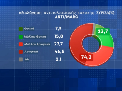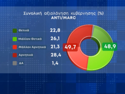 Το 48,9% αξιολογεί θετικά την κυβέρνηση ενώ αρνητικά την κρίνει το 49,7% των ερωτηθέντων. Στην αξιολόγηση για τον ΣΥΡΙΖΑ το 74,2% κρίνει αρνητικά το κόμμα της αξιωματικής αντιπολίτευσης.