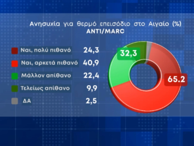 Για τα ελληνοτουρκικά, η συντριπτική πλειοψηφία των πολιτών 65,2% θεωρεί ότι είναι πιθανό το ενδεχόμενο πρόκλησης θερμού επεισοδίου. Πολύ, απαντά το 24,3% και αρκετά, το 40,9%.