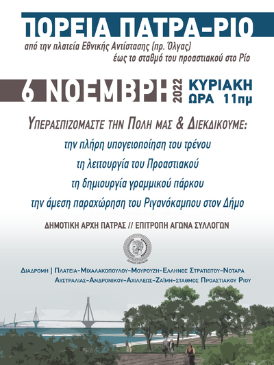 Πορεία για την υπογειοποίηση της σιδηροδρομικής γραμμής πραγματοποιεί στις 6 Νοεμβρίου η Δημοτική Αρχή της Πάτρας και η Επιτροπή Αγώνα Συλλόγων. Όπως αναφέρει ανακοίνωση: