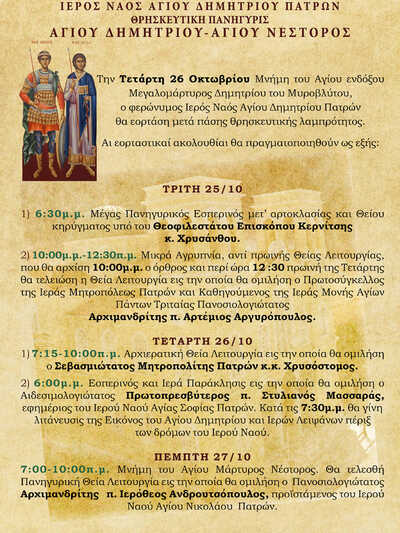 Πλήθος πιστών συνέρρευσε από το απόγευμα της Τρίτης 25/10 στον ιερό ναό του Αγίου Δημητρίου για να ανάψουν το κερί τους και να πάρουν ένα κομμάτι άρτο. Τον εσπερινό τέλεσε ο Θεοφιλέστατος Επίσκοπος Κερνίτσης κ. Χρύσανθος που επίσης μίλησε για τον Άγιο Δημήτριο. Τις ιερές ακολουθίες μετέδωσε η τηλεόραση του "Λύχνου", της Ιεράς Μητροπόλεως Πατρών.