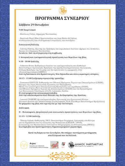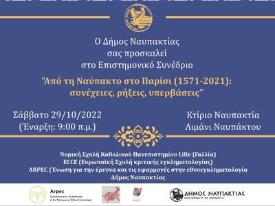 Ο Δήμος Ναυπακτίας σε συνεργασία με τη Νομική Σχολή του Καθολικού Πανεπιστημίου της Lille (Γαλλία), την Ευρωπαϊκή Σχολή κριτικής εγκληματολογίας (ECCE), την Ένωση για την έρευνα και τις εφαρμογές στην εθνοεγκληματολογία (ARPEC) διοργανώνουν το Επιστημονικό Συνέδριο «Από τη Ναύπακτο στο Παρίσι (1571-2021): συνέχειες, ρήξεις, υπερβάσεις» το Σάββατο 29 Οκτωβρίου 2022, ώρα 9 το πρωί έως τις 18:00, στο κτίριο Ναυπακτία (Λιμάνι Ναυπάκτου).