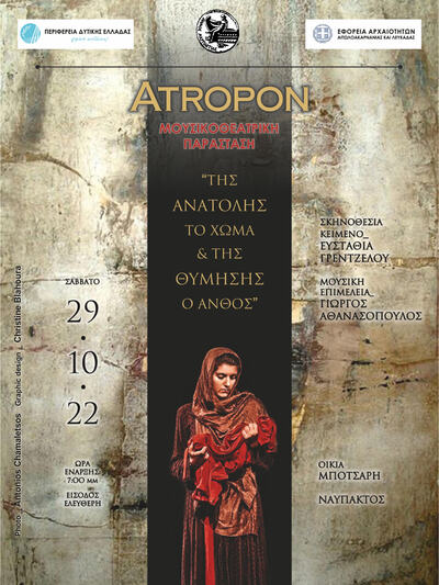 19:00, Μουσική παράσταση από το Μουσικό Σχήμα «Άτροπον», «Της Ανατολής το χώμα & της θύμησης ο ανθός…», αφιέρωμα στην επέτειο των 100 χρόνων από τη Μικρασιατική Καταστροφή, Τμήμα Πολιτισμού της Περιφέρειας Δυτικής Ελλάδας σε συνεργασία με την Εφορεία Αρχαιοτήτων Αιτωλοακαρνανίας και Λευκάδος, Ίδρυμα Δημητρίου και Αίγλης Μπότσαρη. Είσοδος Ελεύθερη.