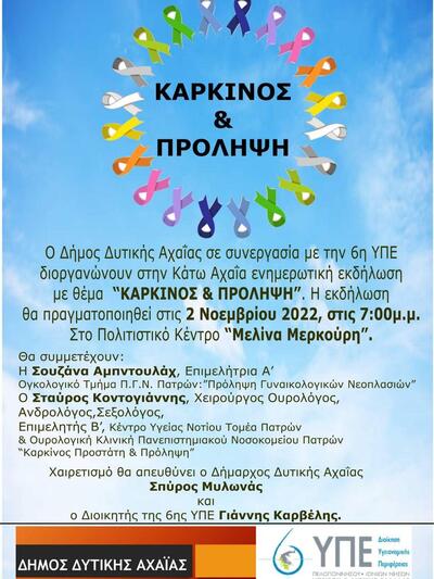 Την Τετάρτη 2 Νοεμβρίου θα πραγματοποιηθεί στην Κάτω Αχαΐα, μια πεκδήλωση με θέμα "Καρκίνος και Πρόληψη" από την 6η ΥΠΕ σε συνεργασία με τον Δήμο Δυτικής Αχαΐας.
