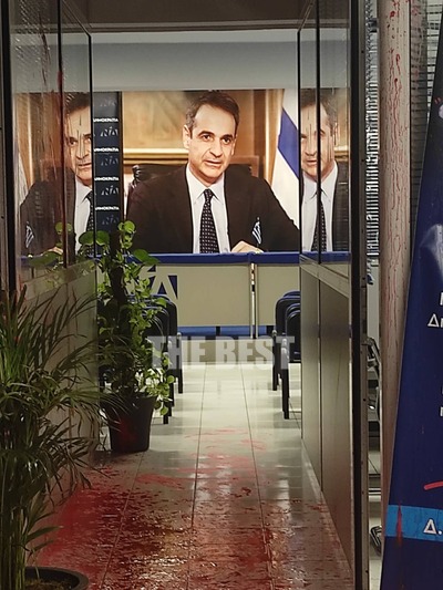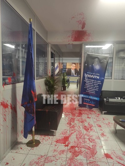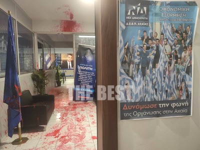 Επίθεση με μπογιές από ομάδα αντιεξουσιαστών σημειώθηκε το απόγευμα της Δευτέρας στα γραφεία της κομματικής οργάνωσης της Νέας Δημοκρατίας, στην Πάτρα, στην οδό Κορίνθου.