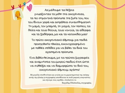 Το βιβλίο δίνει την ευκαιρία σε όλα τα μικρά παιδιά να γνωρίσουν όλα τα μέλη της πυρηνικής και διευρυμένης οικογένειας τους, ως και τα αγαπημένα τους κατοικίδια! Αλλά και να διαβάσουν τις πρώτες τους λέξεις.