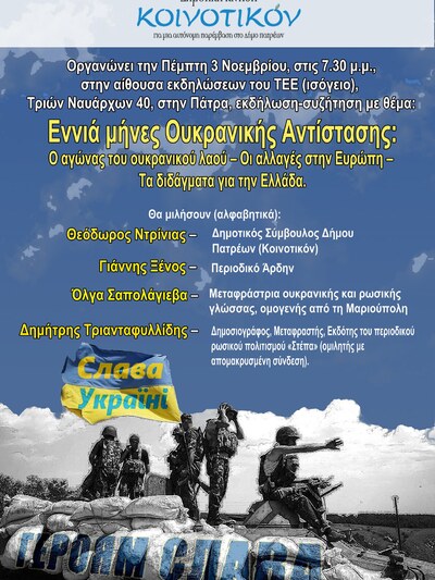 Η Δημοτική Κίνηση Κοινοτικόν διοργανώνει εκδήλωση για την Ουκρανία την Πέμπτη 3 Νοεμβρίου 2022, στις 7.30 μ.μ., στην αίθουσα εκδηλώσεων του ΤΕΕ (ισόγειο), στην Τριών Ναυάρχων 40, στην Πάτρα.