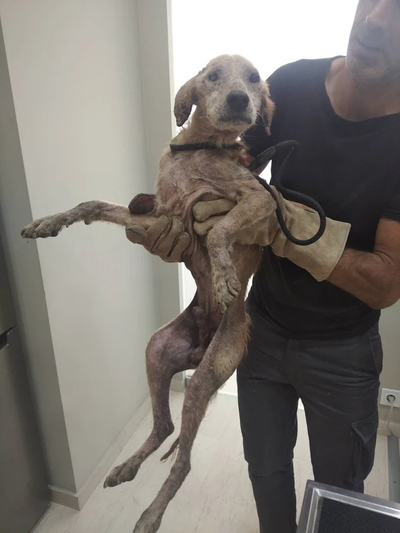 Σαρκοπτική ψώρα, καλα άζαρ, τυφλός από το ένα μάτι και με το ζόρι 9 κιλά. Οι εξετάσεις του δεν είναι ότι καλύτερο αλλά θα μπορούσε να είναι πολύ χειρότερα. Το συκώτι του έχει πειραχτεί και πρέπει να ξεκινήσει άμεσα θεραπεία.