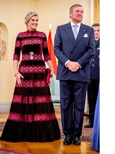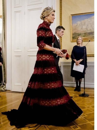 Aκολούθησε μια πολύ εντυπωσιακή, βραδινή εμφάνιση με μπορντό τουαλέτα Costarellos (Χρήστος Κωσταρέλλος) από βελούδο και δαντέλα που κατέληγε σε φούστα με πτυχές. Με αυτή τη δημιουργία δέσποσε στο Προεδρικό Μέγαρο με οικοδέσποινα την Κατερίνα Σακελλαροπούλου. Στο κεφάλι της φορούσε την ιστορική τιάρα Mellerio Ruby Parure.