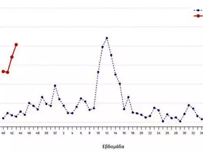 Δείτε το σχετικό διάγραμμα του ΕΟΔΥ που αποτυπώνει τα κρούσματα γριπώδους συνδρομής ανά 1.000 επισκέψεις σε γιατρό.