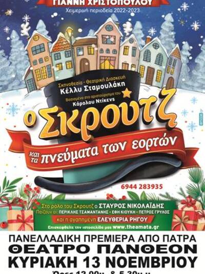 Η παιδική σκηνή του Γιάννη Χριστόπουλου συνεχίζοντας την επιτυχημένη δεκαεπτάχρονη πορεία της, με ιδιαίτερη χαρά παρουσιάζει φέτος την πιο επίκαιρη Χριστουγεννιάτικη ιστορία βασισμένη πάνω στο γνωστό έργο του ΚΑΡΟΛΟΥ ΝΤΙΚΕΝΣ (Μία Χριστουγεννιάτικη ιστορία) "O Σκρουτζ και τα Πνεύματα των Εορτών".