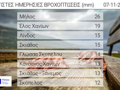 Συγκεκριμένα, το μεγαλύτερο ύψος βροχής έως τις 06:30 σημειώθηκε στον μετεωρολογικό σταθμό της Μήλου και ήταν 26 χιλιοστά, ενώ ακολούθησαν Έλος Χανίων (19), Λίνδος Ρόδου (15), Σκιάθος (15) και Γλώσσα Σκοπέλου (14 χιλιοστά).