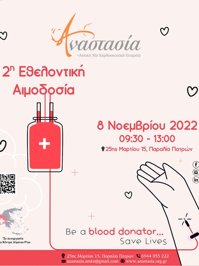 2η Εθελοντική Αιμοδοσία, ώρες από 09.30-13.00 στα γραφεία στην οδό 25ης Μαρτίου 15, Παραλία Πατρών