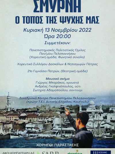 Ο Πανεπιστημιακός Πολιτιστικός Όμιλος «Τέχνης Κίνηση» (Πανεπιστήμιο Πελοποννήσου) σε συνεργασία με τη Χορευτική ομάδα του Συλλόγου Δασκάλων & Νηπιαγωγών Πάτρας και τη Θεατρική ομάδα του 21ου Γυμνασίου Πατρών συμμετέχει στις επετειακές, αφιερωματικές εκδηλώσεις για τα «100 χρόνια από τη Μικρασιατική Καταστροφή» του 1922, με το ανέβασμα της μουσικοχορευτικής – θεατρικής παράστασης με τίτλο «Σμύρνη, ο τόπος της ψυχής μας».