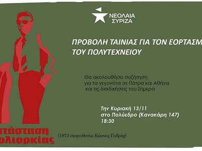 Η Νεολαία ΣΥΡΙΖΑ Αχαΐας με αφορμή την 49η επέτειο εξέγερσης του Πολυτεχνείου διοργανώνει προβολή της ταινίας ‘’Κατάσταση Πολιορκίας – Etat de Seige” του καταξιωμένου Ελληνογάλλου κινηματογραφικού δημιουργού Κώστα Γαβρά («Z», «Ο Αγνοούμενος»). Η προβολή θα πραγματοποιηθεί την Κυριακή 13 Νοεμβρίου στις 18.30 το απόγευμα στο Πολύεδρο στην οδό Κανακάρη 147.