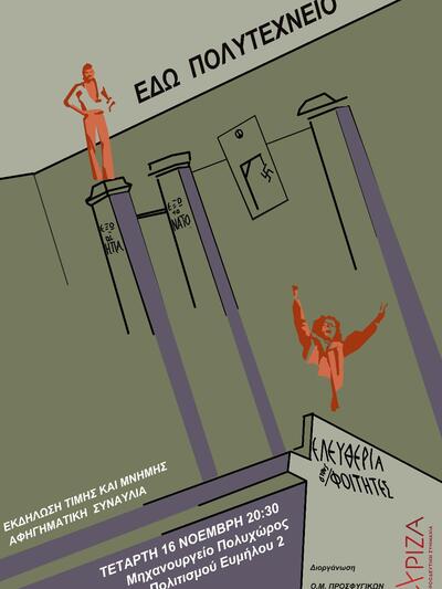 Εκδήλωση τιμής και μνήμης – αφηγηματική συναυλία για την επέτειο του Πολυτεχνείου διοργανώνει η Οργάνωση Μελών Προσφυγικών της Νομαρχιακής Επιτροπής Αχαΐας του ΣΥΡΙΖΑ – Προοδευτική Συμμαχία.
