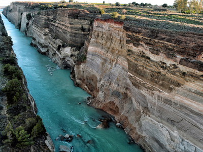 Κάτω από τον γαλανό ελληνικό ουρανό, ένα πλοίο περνά ανάμεσα στα απόκρυμνα τοιχώματα ενός στενού, τεχνητού καναλιού, με περιθώριο μόλις λίγων εκατοστών σε κάθε άκρη, καθώς οι επιβάτες απολαμβάνουν το θαύμα της μηχανικής.