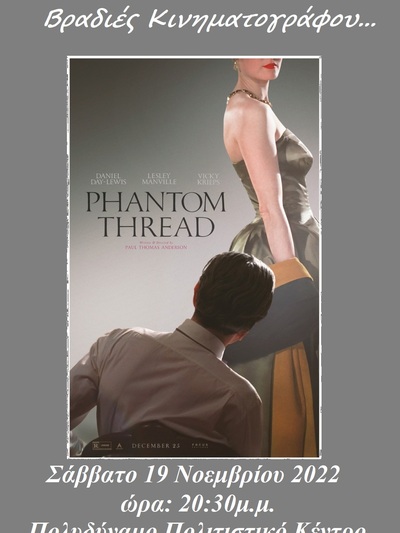 Πιο συγκεκριμένα το Σάββατο 19 Νοεμβρίου 2022 & ώρα: 20:30μ.μ θα προβληθεί η εξαιρετική ταινία «Αόρατη Κλωστή - Phantom Thread».