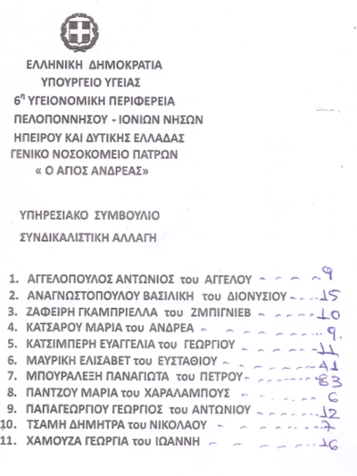 Σχετικά με τις εκλογές του Υπηρεσιακού του Γενικού Νοσοκομείου Πατρών «Ο Άγιος Ανδρέας», εστάλη ανακοίνωση από την Συνδικαλιστική Αλλαγή που αναφέρει τα εξής: