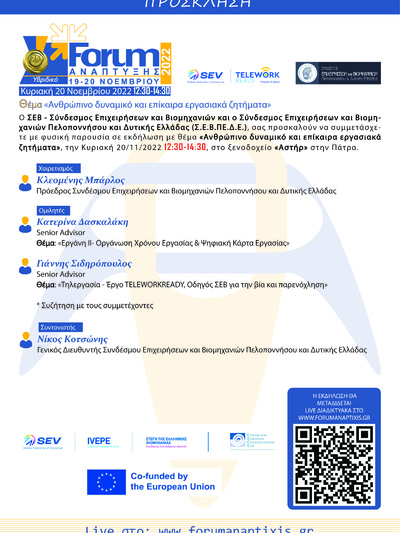 Ο Σύνδεσμoς Επιχειρήσεων και Βιομηχανιών Πελοποννήσου και Δυτικής Ελλάδας πραγματοποιεί μαζί με τον ΣΕΒ΄, εκδήλωση την Κυριακή 20 Νοεμβρίου και ώρα 12.30 στο Ξενοδοχείο ΑΣΤΗΡ στο 25o FORUM ΑΝΑΠΤΥΞΗΣ.