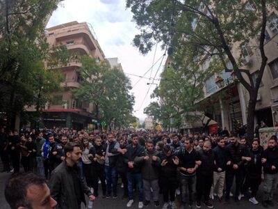 Στην κεφαλή της πορείας από το Πολυτεχνείο προς την πρεσβεία των ΗΠΑ προπορεύεται η αιματοβαμμένη σημαία, η οποία μεταφέρεται από τα χέρια μελών της ΠΑΣΠ.