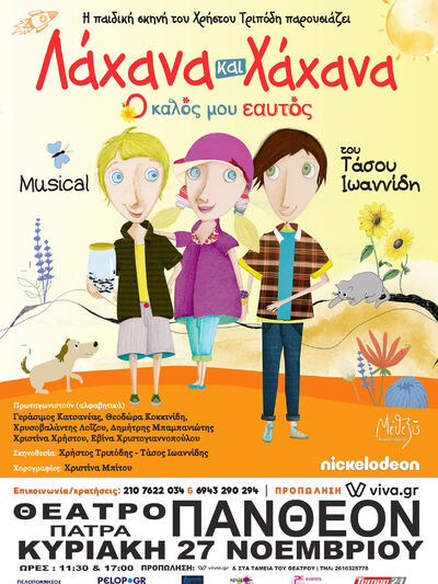 Μετά τη sold out περιοδεία του περασμένου καλοκαιριού σε όλη την Ελλάδα και, παράλληλα με τις παραστάσεις στο «Θέατρον» του Κέντρου Πολιτισμού «Ελληνικός Κόσμος», στην Αθήνα, η παιδική σκηνή του Χρήστου Τριπόδη και η εταιρεία ΜΕΘΕΞΙΣ παρουσιάζουν στο κοινό της περιφέρειας το αγαπημένο μιούζικαλ για παιδιά του Τάσου Ιωαννίδη, με τίτλο «Λάχανα και Χάχανα - Ο Καλός μου Εαυτός». Το έργο θα «ταξιδέψει» την Κυριακή 27 Νοεμβρίου 2022 στο Θέατρο Πάνθεον στην οδό Γούναρη και Κανακάρη, στην Πάτρα όπου & θα δοθούν 2 παραστάσεις στις 11:30 και στις 17:00.