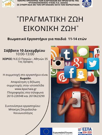 Το Κέντρο Πρόληψης των Εξαρτήσεων και Προαγωγής της Ψυχοκοινωνικής Υγείας Αχαΐας, «Καλλίπολις», διοργανώνει εργαστήριο για παιδιά ηλικίας 11-14 ετών, σχετικά με την εικόνα στα social media, με τίτλο: «Πραγματική ζωή – Εικονική ζωή».
