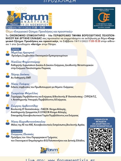 Μία σημαντική και ενδιαφέρουσα εκδήλωση, θα πραγματοποιήσει το Οικονομικό Επιμελητήριο Βορειοδυτικής Πελοποννήσου και Δυτικής Ελλάδος, στο πλαίσιο του 25ου Φόρουμ Ανάπτυξης που θα διεξαχθεί το Σάββατο 19 Νοεμβρίου 2022, ώρα 17:00, στο ξενοδοχείο Αστήρ, στην οδό Αγ. Ανδρέου και Αράτου.