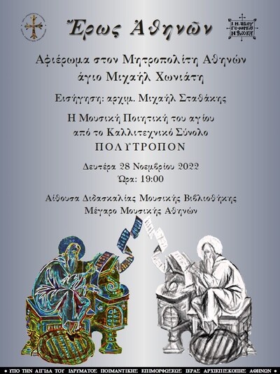 Την ερχόμενη Δευτέρα 28 Νοεμβρίου 2022, στις 19:00, στην Αίθουσα Διδασκαλίας της Μουσικής Βιβλιοθήκης στο Μέγαρο Μουσικής Αθηνών, θα πραγματοποιηθεί ένα αφιέρωμα στον λόγιο Μητροπολίτη Αθηνών άγιο Μιχαήλ Χωνιάτη (1138-1222), με τον τίτλο «Ἔρως Ἀθηνῶν».
