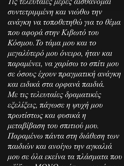 «Τις τελευταίες μέρες αισθάνομαι συντετριμμένη και νιώθω την ανάγκη να τοποθετηθώ για το θέμα που αφορά στην Κιβωτό του Κόσμου.Το τάμα μου και το μεγαλύτερό μου όνειρο, ήταν και παραμένει, να χαρίσω το σπίτι μου σε όσους έχουν πραγματική ανάγκη και ειδικά στα ορφανά παιδιά.
