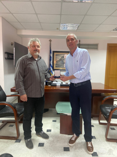 Τον μαθητή του 1ου ΓΕΛ Ναυπάκτου, Γιώργο Μελίστα και τον καθηγητή Φυσικής του 3ου Γυμνασίου Ναυπάκτου, Αργύρη Δρίβα υποδέχθηκε στο Δημαρχείο της γειτονικής πόλης, ο Δήμαρχος Ναυπακτίας Βασίλης Γκίζας.