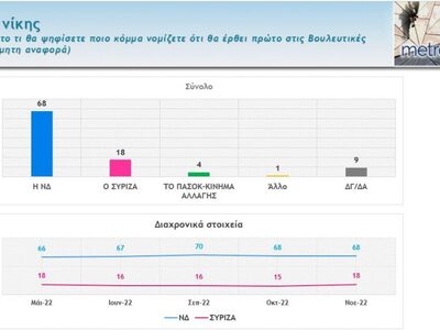 Συντριπτική είναι η διαφορά στην παράσταση νίκης με τη ΝΔ να παίρνει ποσοστό 68% και τον ΣΥΡΙΖΑ 18%, αυξανόμενο, όμως κατά 3 ποσοστιαίες μονάδες από τον Οκτώβριο.