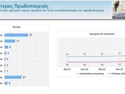 Καταλληλότερος για πρωθυπουργός ψηφίζεται με ποσοστό 37% ο Κυριάκος Μητσοτάκης και ακολουθεί ο Αλέξης Τσίπρας με 17% (διαφορά 20 μονάδων) και ο Νίκος Ανδρουλάκης με 6%. Εδώ φαίνεται να υπάρχει μια παγίωση της διαφοράς τους τελευταίους μήνες.