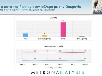 Κατά της Ρωσίας στον πόλεμο με την Ουκρανία δηλώνει το 72%, ποσοστό κατά μία μονάδα μειωμένο από τον Οκτώβριο ενώ υπέρ είναι το 16%, δύο μονάδες αυξημένο.