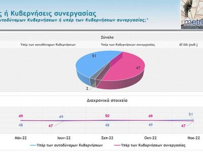 Υπέρ των αυτοδύναμων κυβερνήσεων τάσσεται το 51% των ερωτηθέντων στην έρευνα ενώ υπέρ κυβερνήσεων συνεργασίας είναι το 47%. Το 51% είναι το υψηλότερο ποσοστό τους τελευταίους μήνες ενώ υποχώρησε το ποσοστό αυτών που θέλουν συνεργασία.