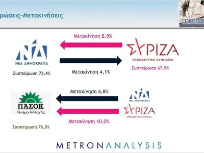 Οι μετακινήσεις των ψηφοφόρων είναι στις 8,5% από τον ΣΥΡΙΖΑ προς τη ΝΔ ενώ 4,1% των ψηφοφόρων παίρνει τον αντίθετο δρόμο. Πρόβλημα για τον ΣΥΡΙΖΑ οι μετακινήσεις προς το ΠΑΣΟΚ που φτάνουν το 10% ενώ από τη ΝΔ προς το ΠΑΣΟΚ είναι στο 4,8%.