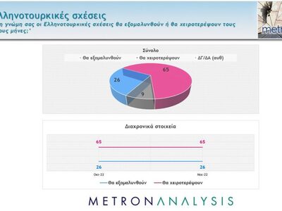 Αναφορικά με τις ελληνοτουρκικές σχέσεις, το 65% των ερωτηθέντων, λέει ότι θα χειροτερέψουν και το 26% ότι θα γίνουν καλύτερες.