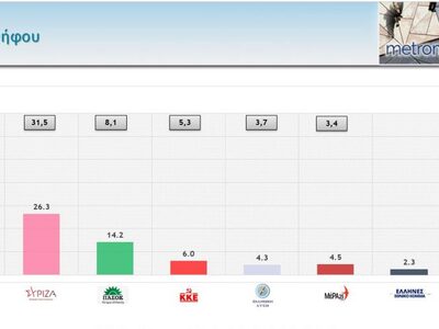 Η ΝΔ λαμβάνει ποσοστό 36,5%, ο ΣΥΡΙΖΑ 26,3%, δηλαδή μια διαφορά 10,2 μονάδων με το κυβερνών κόμμα να δείχνει ικανό (με βάση αυτή τη μέτρηση) να «χτυπήσει» την αυτοδυναμία.