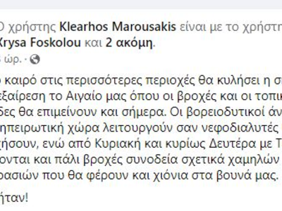 Ο Κλέαρχος Μαρουσάκης, σε ανάρτησή του αναφέρει ότι «οι βορειοδυτικοί άνεμοι που για την ηπειρωτική χώρα λειτουργούν σαν νεφοδιαλυτές θα κυριαρχήσουν, ενώ από Κυριακή και κυρίως Δευτέρα με Τετάρτη μας έρχονται και πάλι βροχές συνοδεία σχετικά χαμηλών θερμοκρασιών που θα φέρουν και χιόνια στα βουνά μας.