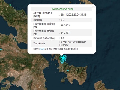 Σεισμός μεγέθους 5 Ρίχτερ σημειώθηκε στην Εύβοια λίγο μετά τις 22.00 το βράδυ σύμφωνα με το Γεωδυναμικό Ινστιτούτο με το επίκεντρο να βρίσκεται 6 χλμ νοτιοανατολικά των Ζαράκων, ενώ το εστιακό βάθος ήταν 8,9 χλμ.