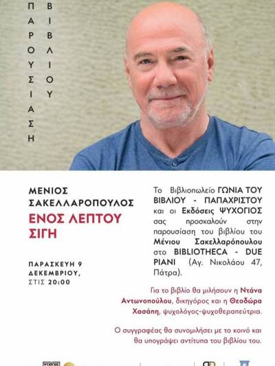 Στην Πάτρα θα παρουσιάσει το νέο του βιβλίο ο Μένιος Σακελλαρόπουλος. Το βιβλίο που κυκλοφόρησε από τις εκδόσεις «Ψυχογιός», έχει τίτλο "Ενός λεπτού σιγή".