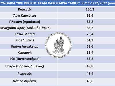 Παρελθόν αποτελεί η κακοκαιρία "Ariel" που επηρέασε την χώρα μας το τελευταίο διήμερο 30/11-1/12. Στην περιοχή της Αχαΐας και στην πόλη της Πάτρας βασικά χαρακτηριστικά της ήταν: