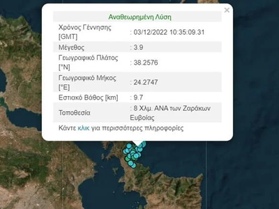 Ακόμη ένας σεισμός σημειώθηκε το πρωί του Σαββάτου στην Εύβοια και έγινε αισθητός και στην Αττική. Ο σεισμός είχε μέγεθος 3,9 Ρίχτερ σύμφωνα με το Γεωδυναμικό Ινστιτούτο και εστιακό βάθος 9,7 χιλιομέτρων. Το επίκεντρο εντοπίζεται 8 χιλιόμετρα Ανατολικά-Νοτιοανατολικά των Ζαράκων.
