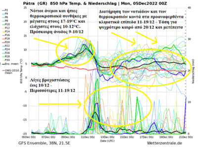 *** Χαρακτηριστικό των όσων προαναφέρθηκαν αποτελεί το παραπάνω διάγραμμα το οποίο παρουσιάζει συγκεντρωμένα όλα τα προγνωστικά σενάρια του αμερικανικού προγνωστικού μοντέλου (GFS: Global Forecasting System) για την πόλη της Πάτρας.