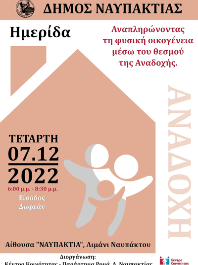 Ο Δήμος Ναυπακτίας ενημερώνει με ανακοίνωση του ότι το Κέντρο Κοινότητας με Παράρτημα Ρομά της Διεύθυνσης Κοινωνικής Αλληλεγγύης και Κοινωνικών Υποθέσεων διοργανώνει Ημερίδα με θέμα: «Αναπληρώνοντας τη φυσική οικογένεια μέσω του θεσμού της Αναδοχής», που θα πραγματοποιηθεί αυτή την Τετάρτη 7 Δεκεμβρίου 2022 & ώρα 18:00, στην αίθουσα «Ναυπακτία», Λιμάνι Ναυπάκτου.